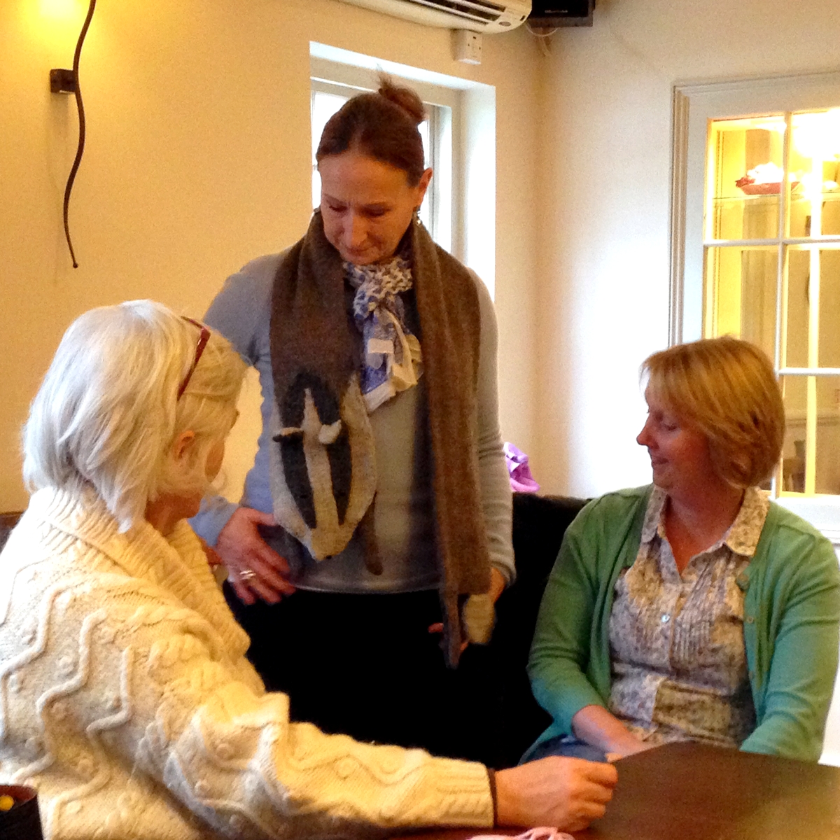 Admiring Helen's Sincerely Louise's badger scarf, modelled by Angela.